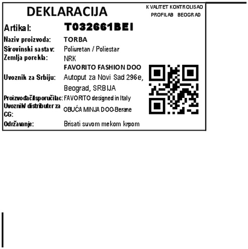 Ova elegantna torba odiše sofisticiranošću i modernim stilom. Izrađena je od kvalitetnog materijala sa finim reljefnim uzorkom koji joj daje luksuzan izgled i teksturu. Nežna bež nijansa čini je svestranim modnim dodatkom koji se lako uklapa uz različite kombinacije – od poslovnih do večernjih outfita.